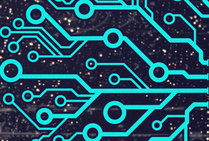 Turquoise circuit lines interconnected with circular components against a dark background resembling a starry night sky.