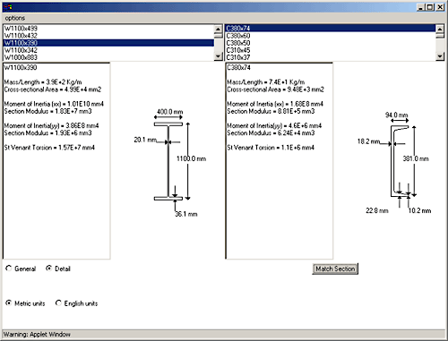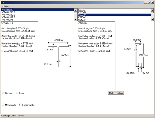 1.2.2 Comparing two sections. Users can compare two sections, by selecting the menu the following way twice: Options->Choose Sections. Moreover, given a section S1 (e.g., beam W1100x390) and a type of section TS (e.g., section C), the program will provide the section of type TS (C) whose section modulus is the closest to that of section S1 (in our example: C380x74).
