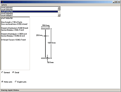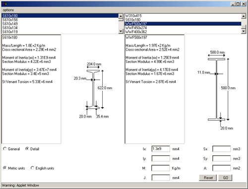 1.1 AbstractThe objective of this project is to create a program that will provide users with a database of [searchable] steel cross-sections and their corresponding geometric properties. The program, it's source code, as well as it's documentation, can all be downloaded free of cost by any individual or corporation. The authors' intend this to be an "open source" product, available for modification and expansion to suit any user's needs. The program is written in JAVA AWT to ensure that it can be run on as wide a variety of platforms as possible. It can be run as an applet on any web-browser without having to download or install programs locally. The program is build as a package and can be fully integrated in other Java applications. JAVA is also a true object-oriented language; programs in this language are relatively simple and robust. | ||