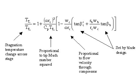 Which is called the Euler Turbine Equation. It relates the temperature ratio (and hence the pressure ratio) across a turbine or compressor to the rotational speed and the change in momentum per unit mass. Note that the velocities used in this equation are what we will later call absolute frame velocities (as opposed to relative frame velocities).