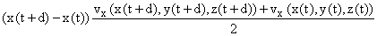 t is the change in x(t) over that interval multiplied by the average value of vx over the endpoints of the interval plus the same thing in y and in z. We write down only the x contribution here, which is