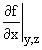 The partial derivative of f with respect to x, keeping y, and z fixed. In general a partial derivative of f with respect to a variable q is the ratio of df to dq when certain other variables are held fixed. Where there is possible misunderstanding over which variables are to be fixed that information should be made explicit. |