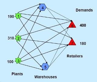 Given demand, production capabilities, and costs of shipment, what is the minimum cost method for satisfying demand? This problem can be solved using a minimum cost flow algorithm, which is covered in this course. (Diagram by Prof. James Orlin.)